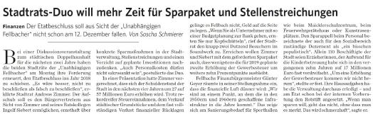 Andreas Zimmer stellte die Analyse der Unabhängigen Fellbacher (UF) zu den Herausforderungen der Fellbacher Finanzlage vor und erläuterte die Anträge und Einsparziele der UF für eine umfassende, strukturelle Haushalts-Sanierung. In der anschließenden Diskussionsrunde mit Herrn Erster Bürgermeister Günter Geyer, Finanzdezernent der Stadt Fellbach, stand die Fragestellung im Vordergrund, in welchen Bereichen Einsparungen zur Verbesserung der Haushaltssituation möglich sind und ob sich die geplanten Gewerbesteuer-Erhöhungen damit vermeiden lassen. Klar wurde hierbei, dass es einfache Antworten nicht gibt, ein "weiter so" aber in Anbetracht der Lage sicher auch nicht die richtige Antwort ist. Die Haushaltsberatungen des Gemeinderats sind derzeit noch in vollem Gange und der Haushalt noch nicht beschlossen.